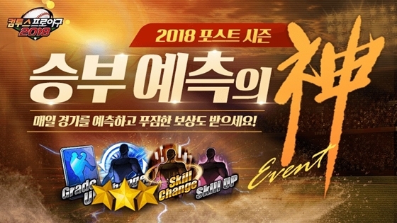 먼저 이번 포스트시즌 기간 동안 진행되는 경기의 승리팀 및 홈런 유무를 예측하는 '승부 예측의 신' 이벤트를 진행한다. '컴프야2018' 이용자라면 누구나 참여할 수 있으며 경기 예측 결과에 따라 최고급 선수를 획득할 수 있는 고급 골드팩, 50스타, FA 영입권 등 푸짐한 선물을 받을 수 있다. 또 이들 유저들에게는 적중한 경기 수만큼 부여되는 누적 포인트 랭킹에 따라 이벤트 종료 후 다양한 혜택을 추가로 제공한다.