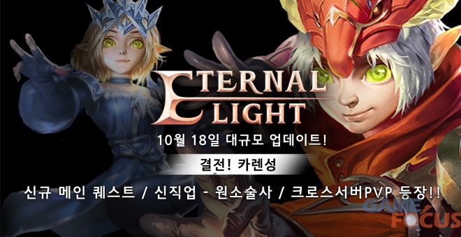 한편, '이터널 라이트'는 금일부터 신규 직업 '원소술사' 공략 이벤트를 시작하고 더불어 신규 유저들을 위한 성장 지원 이벤트와 복귀 유저들의 귀환을 돕는 이벤트를 시작한다. 참여하는 신규 유저들에게는 점핑 비약과 뇌신의 제물, 얼음 심장, 줄루의 피, 화염의 영혼 등이 보상으로 제공되며, 복귀 유저들을 위해서는 10월 18일부터 22일까지 매일 접속 보상과 일일 활약도 100 달성 횟수에 따라 추가 보상이 지급된다.