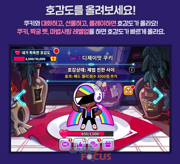유저가 직접 수집한 쿠키들과 함께 상호작용하고 캐릭터에 대한 매력도와 만족도를 높일 수 있는 '쿠키 호감도' 시스템이 새롭게 공개됐다.