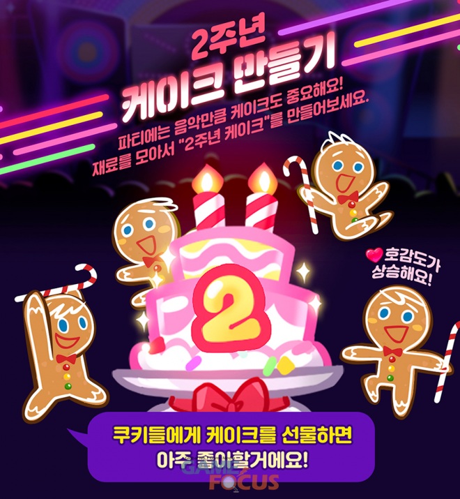 다음 달 8일까지 '2주년 케이크 만들기' 이벤트도 펼쳐진다. 게임 플레이를 통해 재료를 모아 2주년 케이크를 만들면 제작 횟수에 따라 크리스탈 선물을 선사한다. 해당 케이크를 쿠키들에게 선물할 경우 호감도를 보다 쉽게 올릴 수도 있다.
