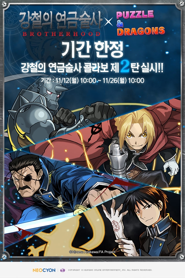 겅호온라인엔터테인먼트(대표 모리시타 가즈키)가 개발하고 모바일 콘텐츠 전문 기업 네오싸이언(대표 기타무라 요시노리)이 서비스 중인 ‘퍼즐앤드래곤’에서 ’강철의 연금술사 BROTHERHOOD’와 콜라보레이션 제 2탄을 진행한다고 12일 밝혔다.