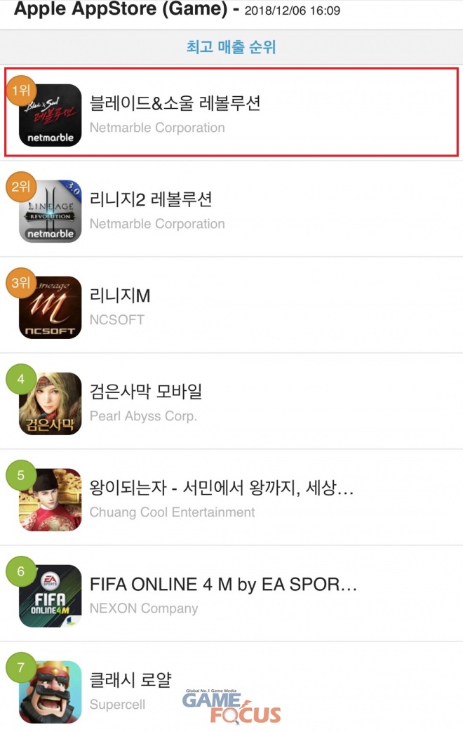 12월 6일 자정(0시)에 출시한 '블레이드 & 소울 레볼루션'은 출시 전 날인 5일 사전 다운로드만으로 애플 앱스토어 인기 1위를 차지하고 출시 당일 구글 플레이 인기 1위를 달성한 데 이어 애플 앱스토어 매출 1위도 점령했다.