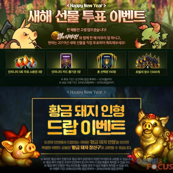 먼저 '선물 투표' 이벤트'는 유저들이 가장 받고 싶은 보상에 투표를 하고 가장 많은 표를 받은 보상을 선물하는 방식이다. 인피니티 5회 무료 소환권 3장, 인피니티 카드 뽑기권 1장, 혼 선택권 150장, 초월의 정수 7,500개가 후보에 올랐다. '초월 칼리돈' 이벤트는 2019년 황금돼지 해를 맞아 초월 칼리돈이 황금 돼지로 변경되고 보상도 상향된다.