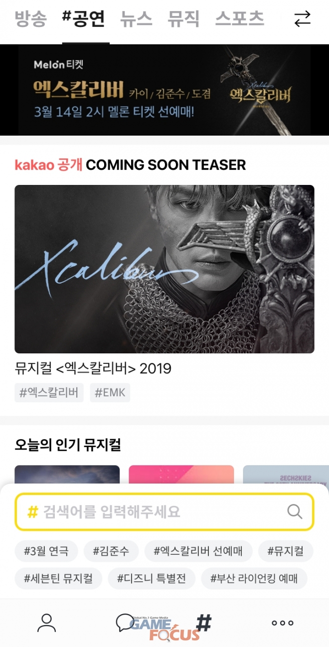 카카오는 #공연 오픈을 기념하여 뮤지컬 '엑스칼리버'의 초대권을 증정하는 이벤트도 14일 자정까지 진행한다. 이벤트에 참여하려면 #공연의 하단 #검색창에 키워드 '엑스칼리버'로 검색하고 뒤이어 나오는 배너를 클릭하면 되며 즉석에서 자동추첨으로 결과를 공지한다.