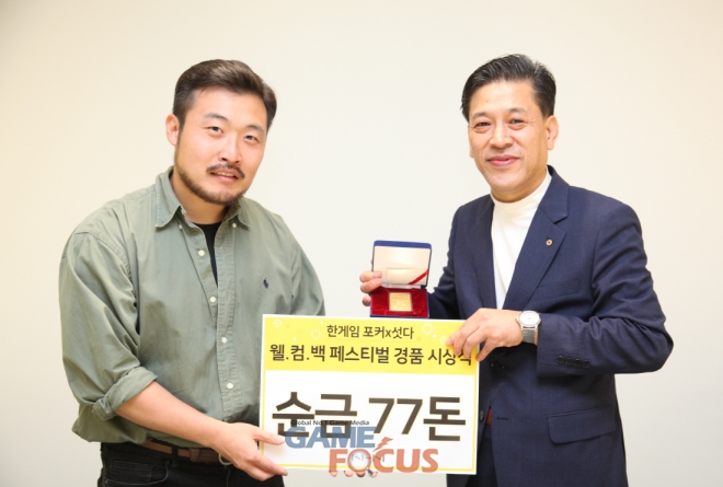 NHN(대표 정우진)가 서비스 중인 모바일 '한게임 포커&섯다'가 애플 앱스토어 런칭 기념 '웰.컴.백 페스티벌' 이벤트의 경품 시상식을 판교 플레이뮤지엄 사옥에서 개최했다.
