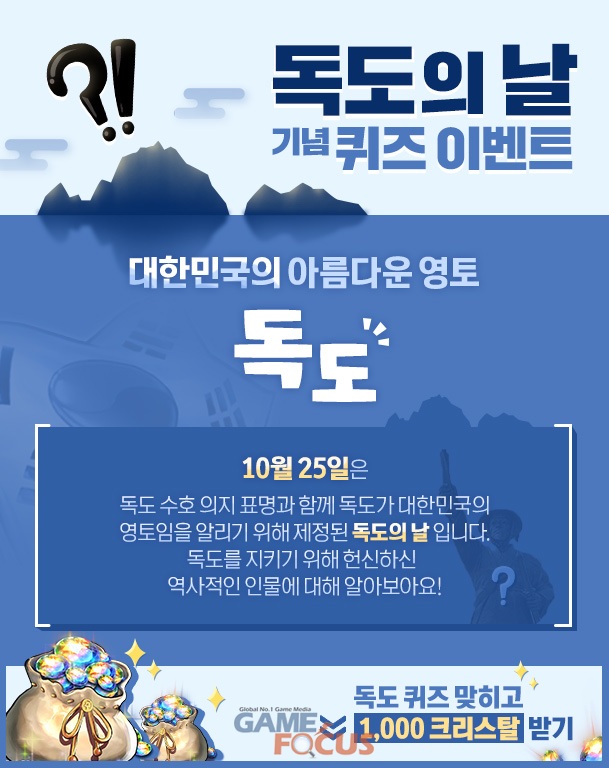 이와 함께 10월 25일 '독도의 날'을 기념해 10월 24일부터 일주일간 독도와 관련된 퀴즈 이벤트가 진행된다. 독도와 관련한 인물을 묻는 간단한 퀴즈를 푼 유저 전원에게 크리스탈 1,000개를 지급한다.