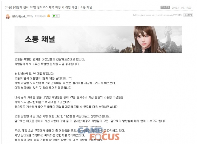 V4 개발진은 지난 9일 필드보스 체력 하향 등 개선 사항을 담은 첫 번째 개발자의 편지를 공개했다. 이 같은 행보는 정식 서비스 개시 3일 만에 나온 발 빠른 대처였다. 이어 11일에는 두 차례에 걸친 개발자의 편지로 필드보스 보상 개선과 필드보스 위치 표시 기능 개발 착수 등 이용자들이 가장 궁금해하는 소식을 알렸다. 게임 채팅창과 공식카페에서는 “유저들과 적극 소통하는 V4 응원한다”, “정보를 상세하게 알려준 덕분에 플레이가 수월하다” 등 응원 메시지가 이어졌다.