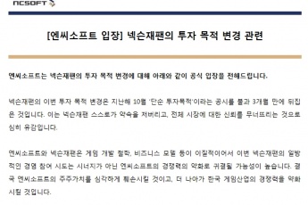 엔씨소프트는 6일, 넥슨이 공개한 (엔씨소프트에 발송된)주주제안서와 관련해 공식 입장을 밝혔다.엔씨소프트 측은 넥슨의 이번 주주제안서 공개에 “최근 양사가 ...