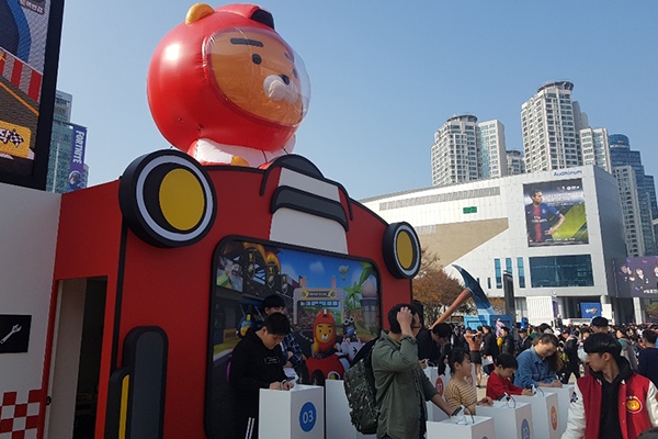 카카오게임즈가 국내 최대 게임 전시회 '지스타 2018'에서 자사의 하반기 기대작 '프렌즈레이싱'의 야외 부스를 운영 중이다. '프렌즈레이싱'은 '카카오프렌즈' IP를 활...