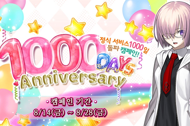 넷마블(대표 권영식, 이승원)이 자사의 모바일 RPG(역할수행게임) '페이트/그랜드 오더(Fate/Grand Order)'에서 서비스 1,000일을 기념한 캠페인을 오는 30일까지 실시한...