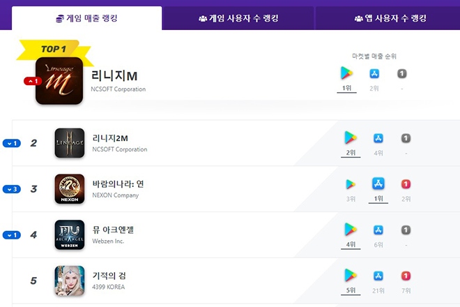 모바일인덱스가 게임 매출을 기준으로 한 7월 모바일 게임 통합 랭킹 차트를 발표했다. 엔씨소프트의 '리니지M'이 출시 이후 줄곧 왕좌를 지켜온 '리니지2M'을 누르고 7...