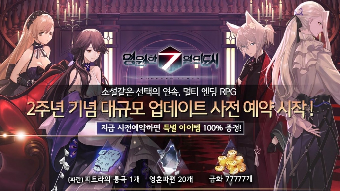 가이아모바일 코리아(대표 양용국)가 자사에서 서비스 중인 미연시 멀티 엔딩 RPG '영원한 7일의 도시'의 게임 서비스 2주년을 기념하는 대규모 업데이트를 선보인다. 이...