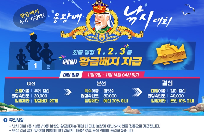 한빛소프트가 '도시어부M'에서 7일부터 14일까지 일주일 간 게임 내 이벤트인 '용왕배 낚시대회'를 진행한다. 예선, 본선, 결선 3단계로 진행되는 이번 이벤트의 1~3위 ...