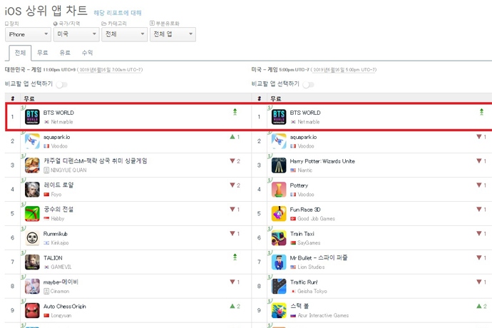 넷마블(대표 권영식)은 26일 저녁 7시 출시한 방탄소년단 매니저 게임 'BTS월드'가 14 시간 만에 글로벌 33개국 애플 앱스토어에서 무료게임 인기 순위 1위를 기록 중이...