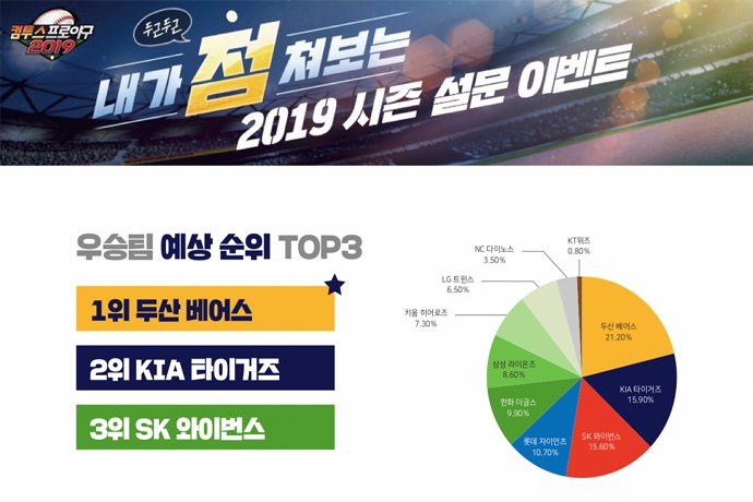 컴투스(대표 송병준)가 개발하고 서비스하는 3D 모바일 야구 게임 ‘컴투스프로야구2019(이하 컴프야2019)’가 유저를 대상으로 '2019 한국 프로야구 정규리그'의 결과를...