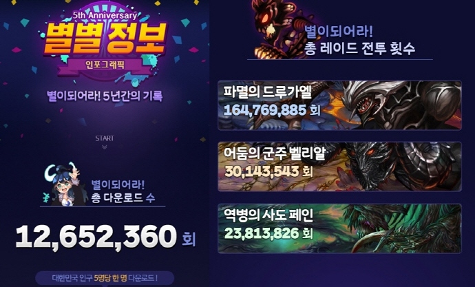 게임빌(대표 송병준)은 18일, 자사가 서비스하는 ‘별이되어라!’의 서비스 5주년을 기념 인포그래픽을 공개했다.17일로 출시 5주년을 맞은 이 게임은 꾸준한 인기를 이...