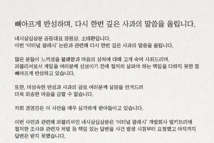 모바일 디펜스게임 신작 '이터널 클래시'가 연일 구설수에 오르는 가운데 서비스사인 네시삼십삼분의 소태환, 장원상 대표가 두번째 사과문을 8일 공개했다.지난 5일 일...