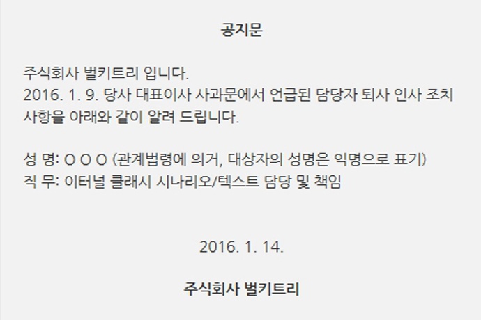 최근 '일베' 논란으로 구설수에 오른 '이터널 클래시'의 개발사인 벌키트리가 2차 사과문을 통해 밝힌대로 논란이 된 문구를 작성하고 검수한 담당자겸 책임자를 퇴사 조...