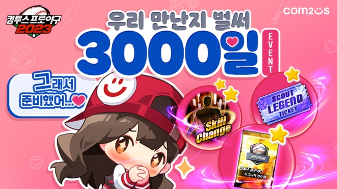 컴투스(대표 이주환)가 ‘컴투스프로야구2023’(이하 컴프야2023) 출시 3,000일을 맞아 기념 선물을 지급하고 특별 이벤트를 실시한다고 밝혔다. ‘컴프야2023’은 KBO리...