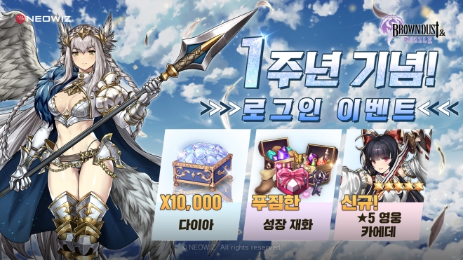 네오위즈(공동대표 김승철, 배태근)의 모바일 3매치 퍼즐 RPG ‘브라운더스트 앤 퍼즐(BrownDust & Puzzle)’이 국내 서비스 1주년을 기념해 푸짐한 보상을 제공하는...