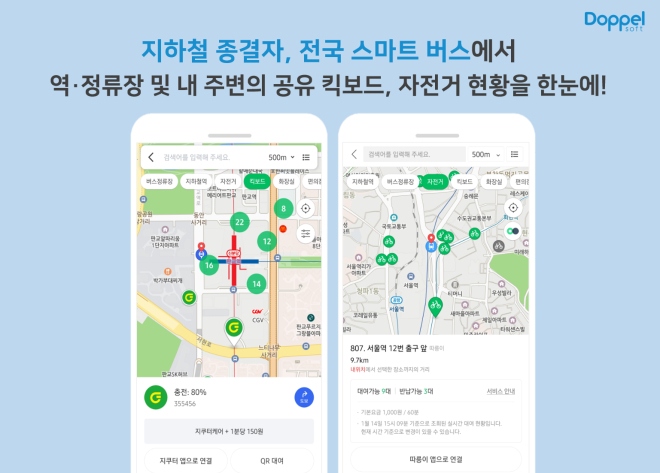 NHN(대표 정우진)의 모빌리티 자회사인 도플소프트(대표 강용혁)가 ‘지하철 종결자’, ‘전국 스마트 버스’ 앱에 공유 킥보드 및 자전거 정보 제공 기능을 추가했다.‘...