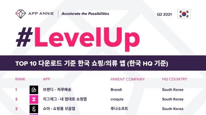 업계에서 가장 신뢰받는 모바일 데이터 및 분석 플랫폼인 앱애니(App Annie)가 2021년 2분기 다운로드 기준 가장 빠르게 성장한 한국 패션·어패럴 쇼핑 앱 상위 10위 차...