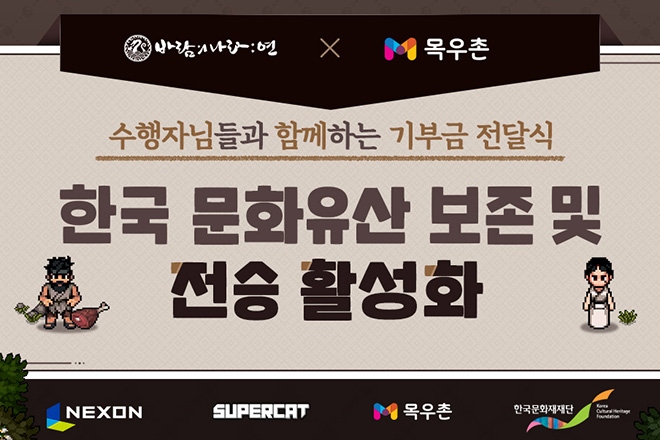 넥슨(대표 이정헌)과 '바람의나라: 연'을 공동개발한 슈퍼캣(대표 김원배)이 목우촌과 함께 판매한 '떡쇠네 뚝심패키지' 수익금 전액을 한국문화재재단에 기부했다. 넥슨...