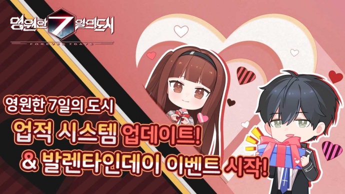 가이아모바일 코리아(대표 양용국)가 자사에서 서비스 중인 미연시 멀티 엔딩 RPG '영원한 7일의 도시'의 업적 시스템을 추가하고 '발렌타인데이 이벤트'를 실시한다. ...