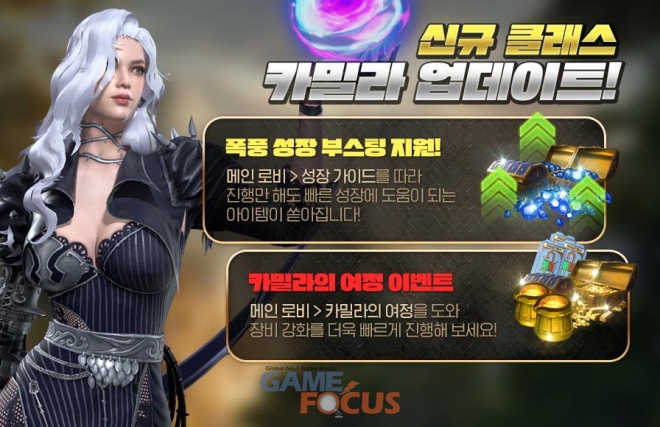 이와 함께, '카밀라' 캐릭터 생성 즉시 높은 전투력을 갖출 수 있는 '불멸 장비 풀세트'를 지급한다. 또 캐릭터 성장을 돕기 위해 스킬과 캐릭터 강화 레벨을 특정 수치까지 자동으로 제공하는 '부스팅 이벤트'를 진행하며, '카밀라' 전용 여정 이벤트를 완료하면 '레지나 코스튬 풀세트'를 추가로 제공한다.
