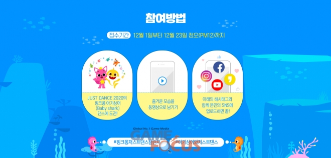 이번 핑크퐁 콜라보레이션 해시태그 캠페인은 '저스트 댄스 2020' 수록곡인 핑크퐁 아기상어를 플레이하는 모습을 담은 영상을 이벤트 응모 해시태그와 함께 SNS에 업로드하면 참여할 수 있다. 이벤트 응모 해시태그는 다음과 같다. #핑크퐁저스트댄스챌린지 #아기상어와저스트댄스