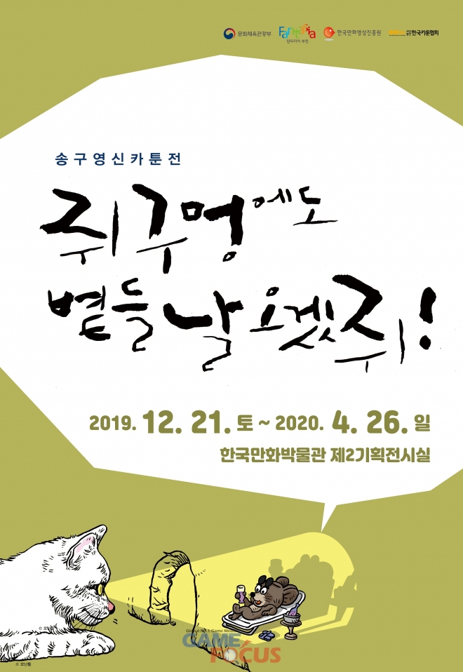 12월 21일(토)부터 2020년 4월 26일(일)까지 한국만화박물관 1층 제2기획전시실에서 열리는 '쥐구멍에도 볕들 날 오겠쥐!' 전시는 쥐를 소재로 한 60점의 송구영신 카툰작품과 연하엽서 등을 만나볼 수 있다.