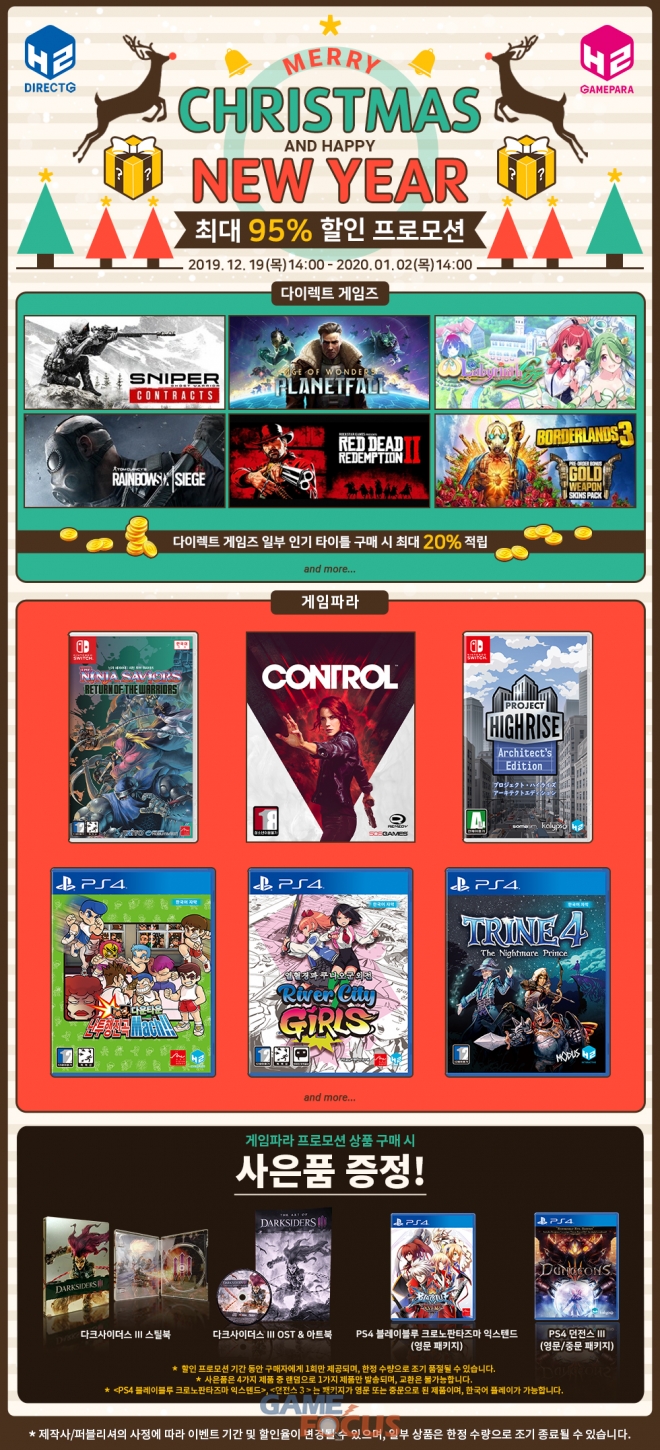 다이렉트 게임즈와 게임파라에서 동시에 진행되는 이번 프로모션은 12월 19일 오후 2시부터 2020년 1월 2일 오후 2시까지 진행되며, 이 기간 동안 신작 및 인기 게임을 최대 95% 할인된 가격에 구매할 수 있다.