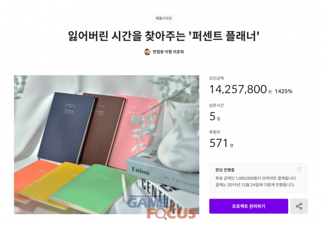 먼저 <잃어버린 시간을 찾아주는 '퍼센트 플래너'>는 시간 관리와 스스로 설정한 목표에 대한 체계적인 피드백이 가능한 플래너 프로젝트다. 창작자가 10년간 직접 사용하면서 지속적인 보완을 거쳐 좁은 의미의 스케줄링에서 벗어나 스스로 설정해 둔 목표에 대한 피드백까지 이루어질 수 있도록 설계됐다. 580여 명의 후원자가 이 뜻에 공감, 약 1,500만 원에 가까운 금액이 모금됐다.
