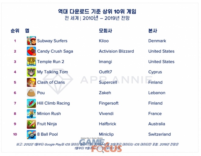 앱애니는 2010년대를 마무리하며 지난 10년간 전 세계 모바일 게임 누적 다운로드 수 및 소비자 지출 상위 10위를 선정해 발표했다.
