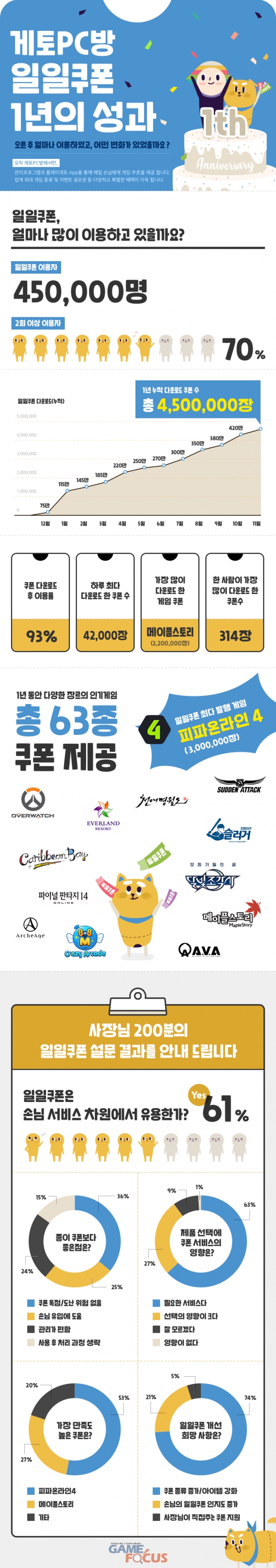 지금까지 총 63종 게임에서 '일일쿠폰' 서비스를 통해 게임 쿠폰을 발행했고, 하루 최다 다운로드 기록은 4만 2천 건이다. '일일쿠폰'에서 가장 많은 인기를 누린 게임은 '메이플스토리'와 'FIFA 온라인 4'였고, 게임 외에도 '캐리비안베이 할인권', '에버랜드 할인권' 등이 인기를 끌었다.