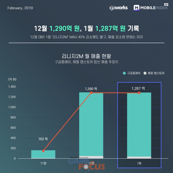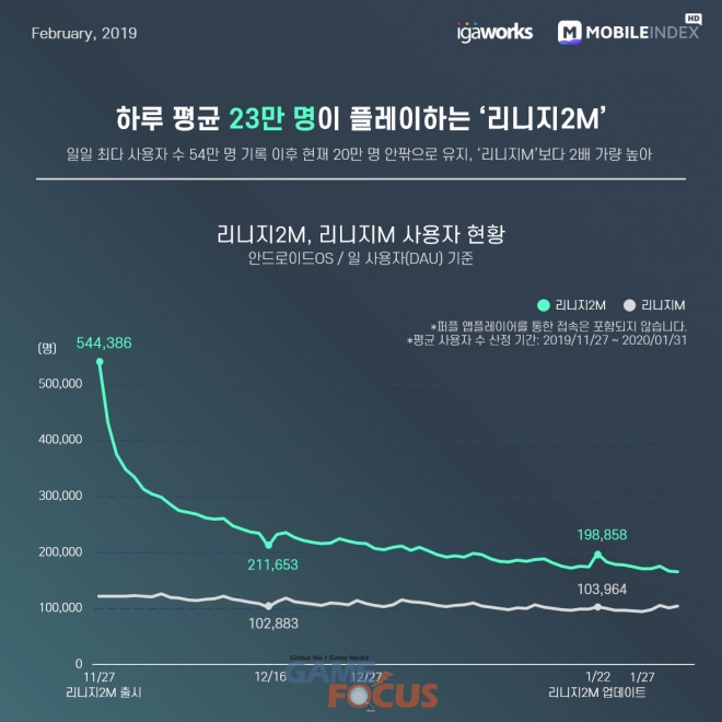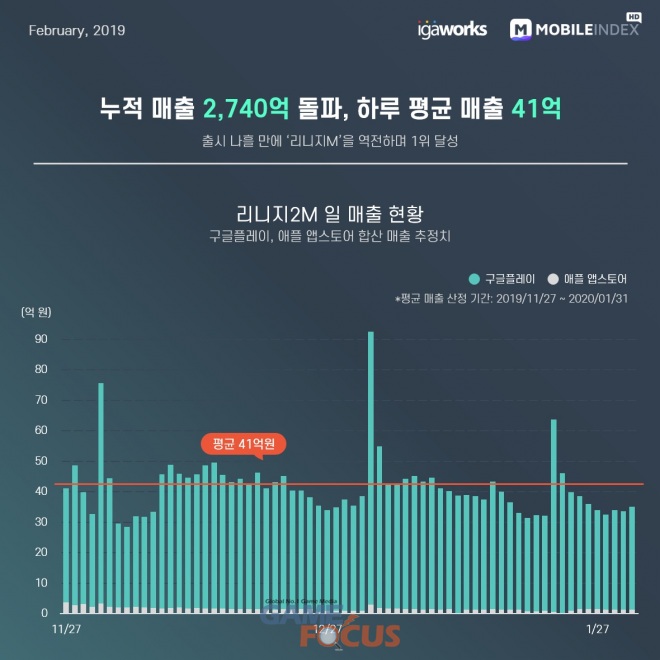 아이지에이웍스의 발표에 따르면 지난 해 11월 27일 출시된 후 나흘만에 기존 구글 플레이 매출 1위 '리니지M'을 누른 '리니지2M'의 2020년 1월 31일까지의 누적 매출액이 2,740억원을 돌파한 것으로 나타났으며 하루 평균 매출은 41억원에 달했다.