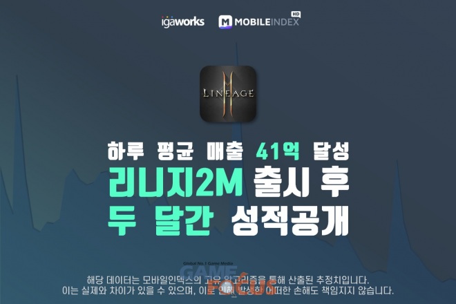 모바일 빅데이터 플랫폼 기업 아이지에이웍스가 모바일인덱스 분석 결과를 바탕으로 하루 평균 매출 41억원을 달성한 <리니지2M 출시 후 두 달간 성적공개> 리포트를 발표했다.