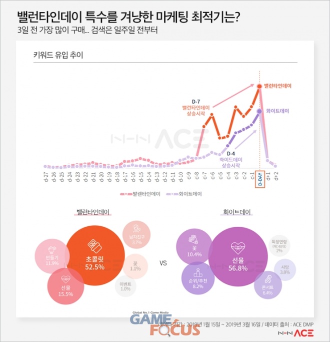 NHN ACE(공동대표 정연훈, 이진수)는 밸런타인데이 시즌을 맞아 데이터 관리 플랫폼 ‘ACE DMP’를 활용, PC·모바일 웹사이트에서 발생한 관련 데이터를 분석한 ‘인사이트 리포트’를 공개했다. 이번 리포트는 작년 밸런타인데이, 화이트데이 시즌(2019년 1월 15일~3월 16일)에 유입된 1만개 이상의 키워드 유입 데이터와 제품 구매 데이터를 분석했다. 키워드 유입 데이터는 웹사이트 방문자가 어떤 단어를 검색해 유입됐는 지 파악할 수 있는 데이터다.