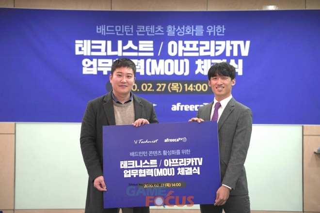 아프리카TV가 27일(목) 판교 아프리카TV 본사에서 배드민턴 용품 전문 브랜드 '테크니스트'와 배드민턴 콘텐츠 활성화를 위한 업무협약(MOU)을 체결했다. 협약식에는 테크니스트 김성신 대표와 아프리카TV 이민원 콘텐츠전략사업본부장이 참석했다.