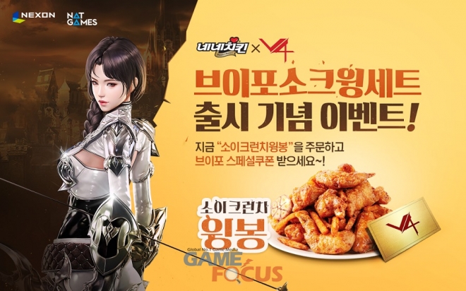 ㈜넥슨(대표 이정헌)은 자회사 ㈜넷게임즈(대표 박용현)에서 개발한 모바일 MMORPG(다중접속역할수행게임) ‘V4(Victory For)’가 네네치킨 신제품 ‘소이크런치윙봉’ 출시 기념 제휴 이벤트를 시작했다고 2일 밝혔다.