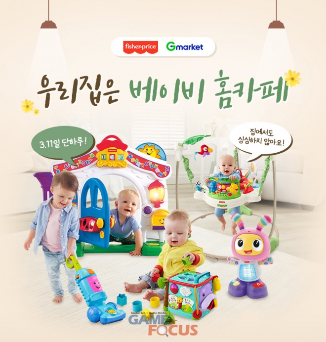 3월 11일 지마켓에서 국민문짝 '클래식 러닝홈'과 점퍼루 부문 베스트셀러 1위의 '레인포레스트 점퍼루' 등피셔프라이스 인기 제품을 최대 67% 할인된 가격에 구매할 수 있다. 또한 지마켓을 통해 아기 연령과 발달별 맞춤 제품을 100일, 200일, 첫돌로 나눠 피셔프라이스 특가 선물 세트로 구성하였다. 전 제품 무료배송되며 스마일클럽 회원에게는 10% 할인쿠폰을 추가로 지급한다.