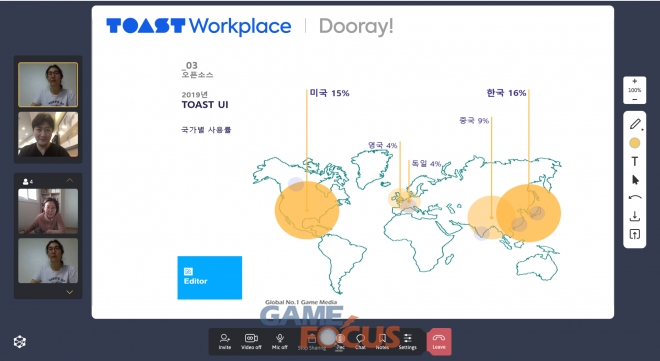 TOAST Workplace Dooray!에 탑재된 화상 회의 기능은 국내 주요 기업의 재택근무가 결정되던 지난달 26일부터 상승 곡선을 그리기 시작해, 3월 첫 주에는 2월 동기간과 비교해 약 25배 증가한 사용량을 나타냈다. TOAST Workplace Dooray!의 화상 회의 서비스는 최대 14명의 다자간 화상 채팅 뿐 아니라, 회의 내용을 기록할 수 있는 노트 및 녹화, 파일 공유 기능 등을 제공하고 있어 높은 호응을 얻고 있다.