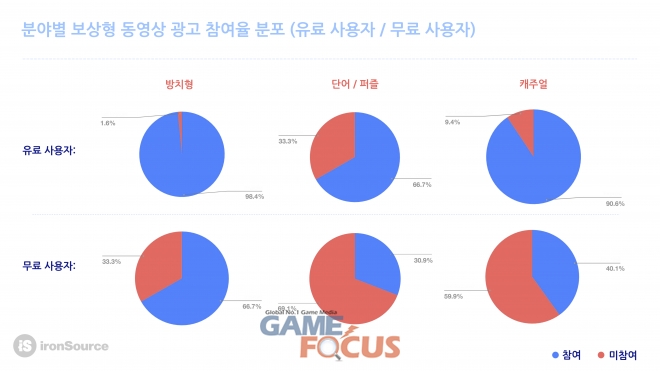 방치형, 단어/퍼즐, 캐주얼, 3개 게임 분야에서 보상형 동영상 참여율은 앱 내 결제 후에도 일관되게 유지됐다. 유저가 광고를 삭제하기 위해 결제를 한다면 결제 후 참여율은 떨어질 것으로 예상된다. 그러나 결제 후에도 참여율이 유지된 것은 유저가 자발적으로 시청하는 보상형 광고와 시스템에서 송출하는 일방적 광고 간 차이에서 기인한다.