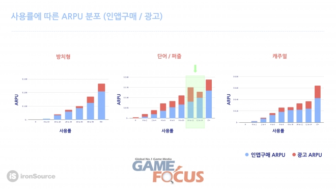 사용자 1인당 평균 인앱 구매 금액인 앱 내 결제 ARPU는 사용률과 비례한다. 이는 보상형 광고가 유저의 지속적인 게임 참여와 진행에 독특한 방식으로 영향을 미치기 때문이다. 만일 2개 지표가 비례하지 않는다면 게임 자체의 문제점을 파악해 광고 등 다른 방법을 통해 정교하고 점진적인 수익화 모델을 도입해야 한다.