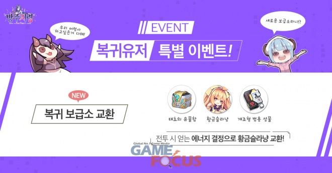 추가로 이번 콜라보레이션 이벤트와 함께 복귀 유저들을 위한 이벤트가 추가된다. 기존에 복귀 유저 전용 포인트를 모아 다양한 아이템으로 교환할 수 있는 이벤트에 추가로 복귀 유저가 게임 접속 시 활성화되는 [복귀보급소] 이벤트는 이벤트에 참여만 해도 슬라냥부터 태초의 유물함 등 다양한 아이템을 보상으로 획득할 수 있는 이벤트이다.