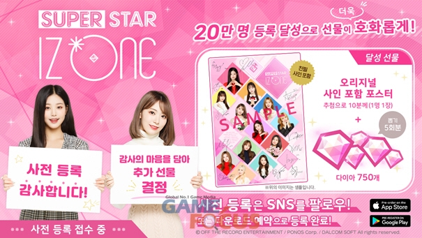 이로써 '슈퍼스타 아이즈원'은 사전예약 20만 참여자 돌파 시, 게임 내 사용할 수 있는 다이아 750개(총 합계 2,250개)를 추가로 제공하며, 추첨을 통해 맴버 전원의 친필 사인이 들어간 '슈퍼스타 아이즈원' 오리지널 포스터를 지급한다.