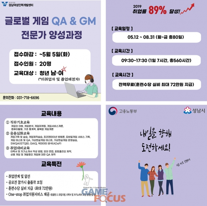 글로벌 게임QA & GM 전문인력 양성과정은 성남여성인력개발센터가 한국게임개발자협회와 함께 진행하는 교육훈련으로, 5월 12일부터 8월 31일까지 총 80일간(1일 7시간, 총 560시간) 전문적인 게임QA와 GM 직무 인재를 육성하고 채용수요가 있는 게임 업계와의 협약을 통해 취업을 지원하는 사업이다.