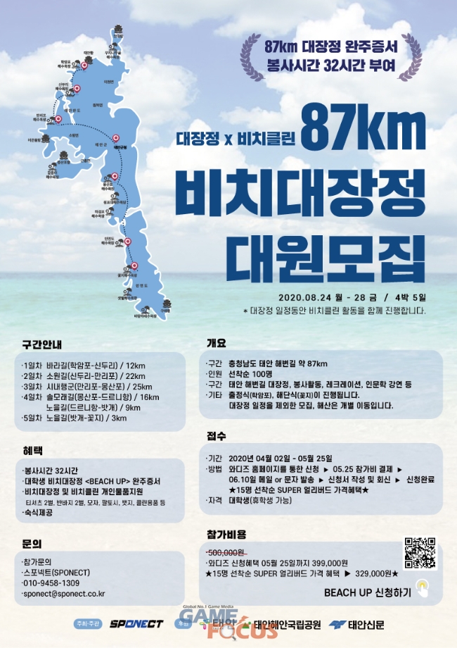 특히 이번 행사는 4박 5일간 태안의 해변 길을 걸으며 '비치코밍'활동을 하는 콘셉트를 바탕으로 준비했으며 이를 위해 태안군청과 태안해안국립공원에서 봉사시간 32시간, 태안해변길 87km 완주증서, 관련된 물품 지원 등의 후원을 승인했다.