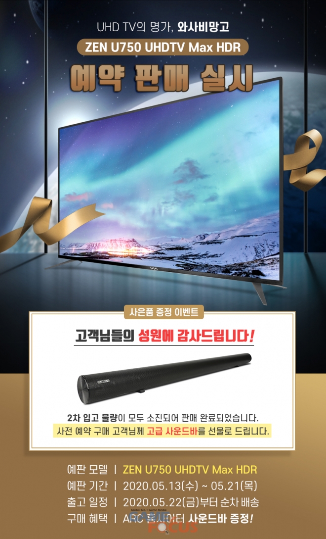 관계자는 "이번에 예약판매를 진행하는 ZEN U750 UHDTV Max HDR은 우수한 성능을 바탕으로 와사비망고에서 인기 있는 대형인치 UHDTV 제품"이라며 "예약 구매를 통해 고객께서 혜택을 더욱 많이 받아 돌아가길 바란다"라고 말했다.