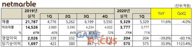 넷마블(대표 권영식, 이승원)이 지난 1분기 연결기준으로 매출 5,329억원, 영업이익 204억원, 순이익 575억원을 기록했다고 13일 밝혔다.